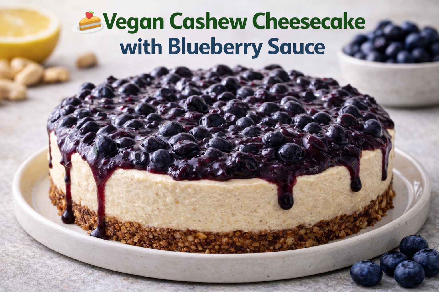 [Recipe] 🍰 Vegan Cashew Cheesecake with Blueberry Sauce
